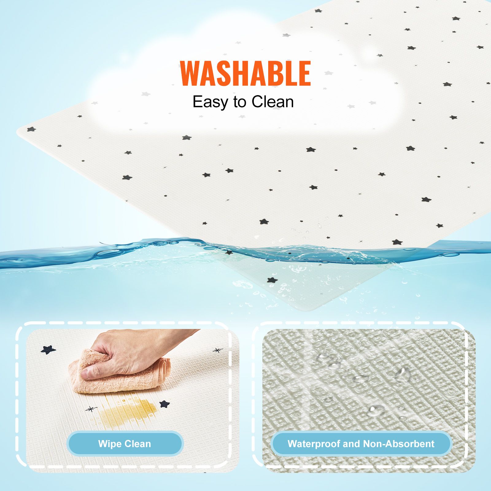 The baby crawling mat has a waterproof surface and edge design, allowing you to wipe away stains, even along the edges, with a damp cloth to keep it fresh and clean. The entire mat can also be washed directly.