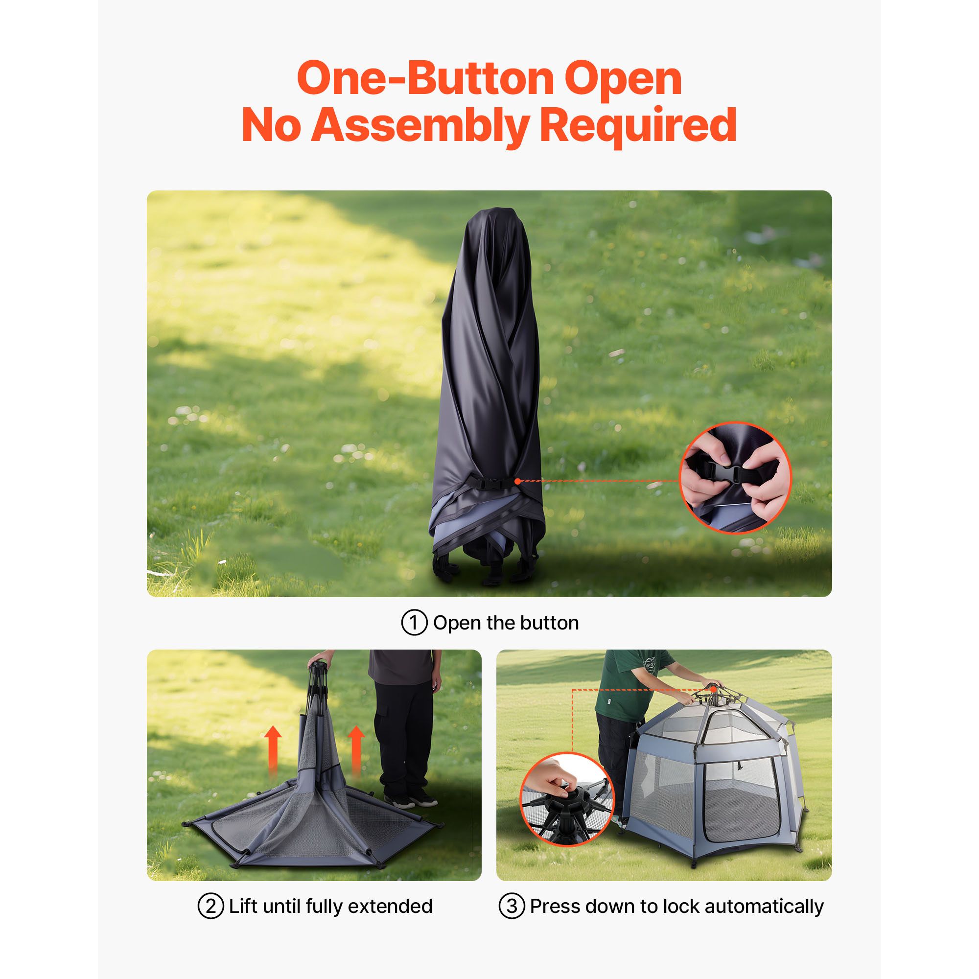 Give your little one a safe space to play and explore with VEVOR 59 x 59 inch (1500 x 1500 mm) spacious baby playpen, featuring a pop-up design, full-enclosure with canopy, breathable mesh, 3 UPF 50+ sunshades, and BPA-free 210D Oxford fabric. Foldable and portable for travel, outdoor adventures.