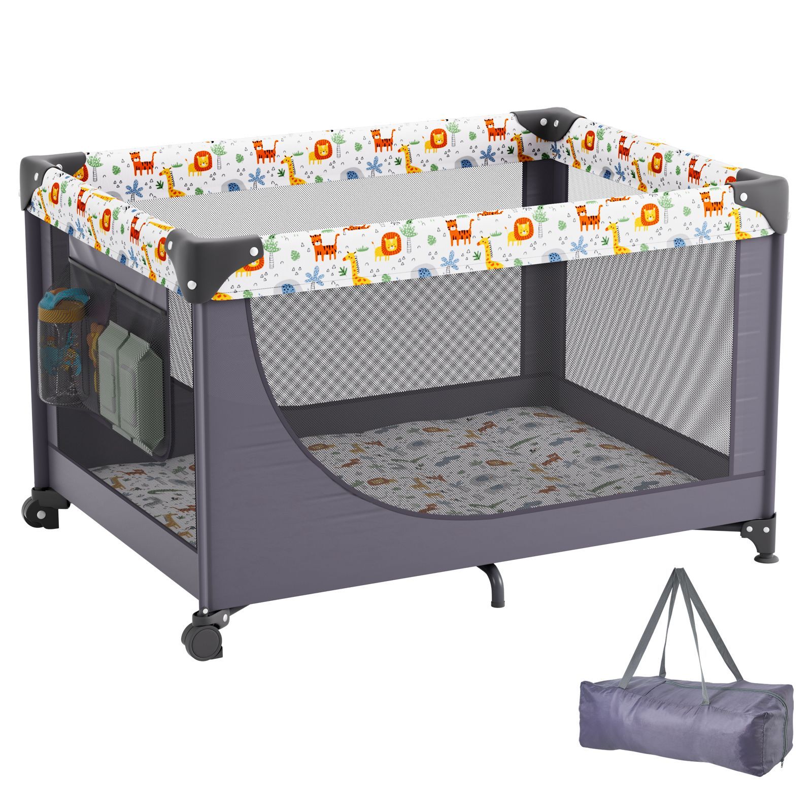 Lightweight and portable, our baby play yard with 2 wheels is perfect for indoors and outdoors. Whether you're in the living room, garden or outside, it provides a safe and cozy space for your baby to play or rest, always keeping them close by.