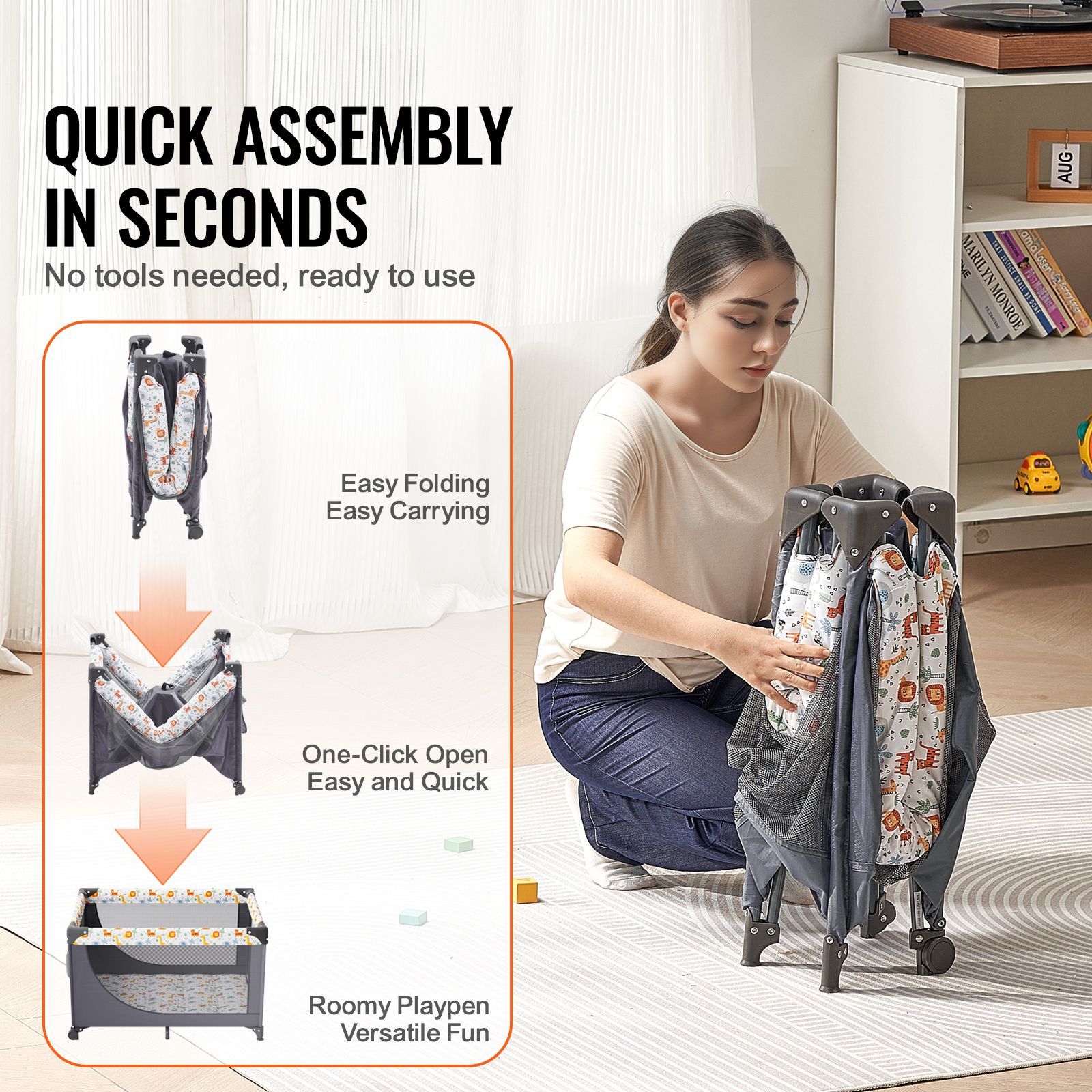 Lightweight and easy to fold, this baby play yard sets up quickly without any tools. After playtime, just fold it up and pack it in the included carrying bag for hassle-free storage and travel, whether you're heading to the park, beach, or visiting family.