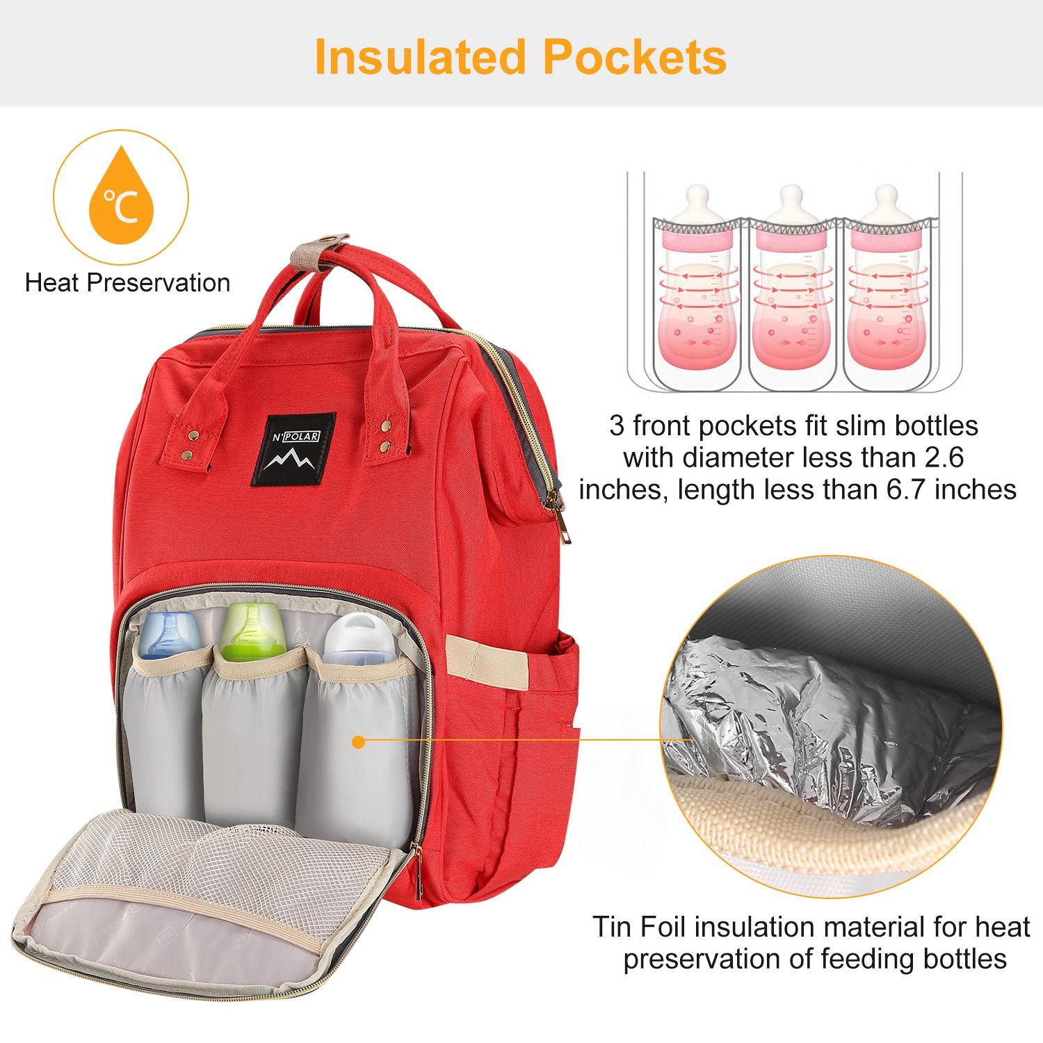**ECONOMICAL & PRACTICAL*:Our diaper bag backpack has many separate storage compartments including 3 insulated pockets,2 side pockets,1 back pocket and 5 interior compartments. You can put milk bottle,water bottle,clothes and diaper etc. in different separate pockets.