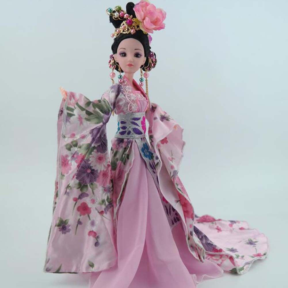 This doll has adorable face with large eyes and rooted hair. The doll wears Chinese ancient style dress, including long sleeves and a floral-print overlay. It's a highly detailed jointed body doll in exquisite costume and accessories, with 12 flexible joints can make various different amazing postures and movements by rotating its joints. The doll's clothes set can be taken off. With delicate makeup and attractive appearance, a good doll toy for kids play fun, also a perfect item for your friends or children birthday gift. NOTE: Not suitable for children under 3 years. The doll cannot stand on her own. The photography props in image 2 are not included.