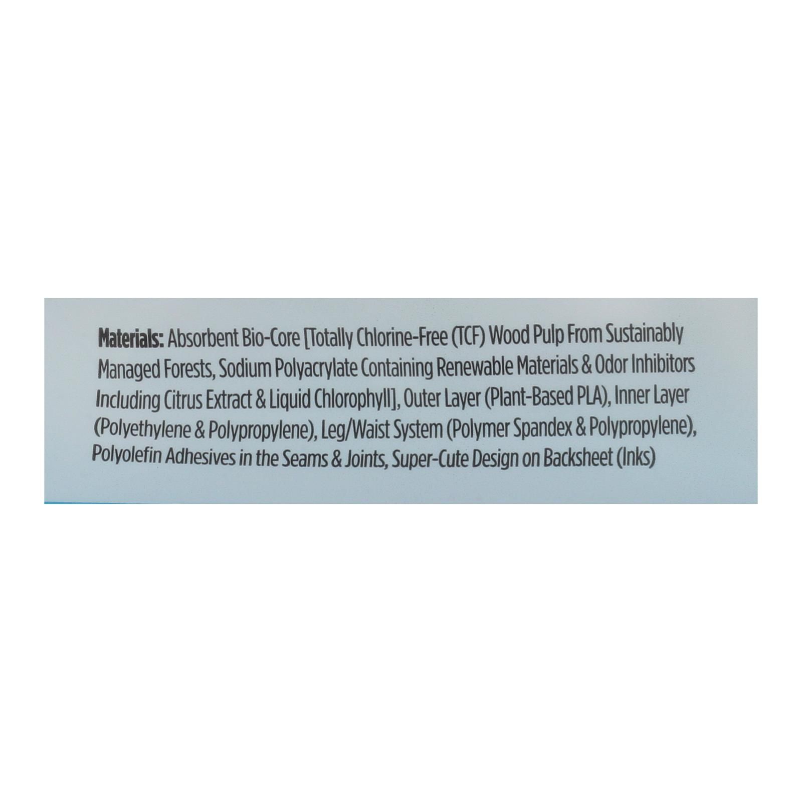 ingredients : absorbent bio-core [totally chlorine-free;tcf;wood pulp from sustainably managed forests;sodium polyacrylate containing renewable materials & odor inhibitors including citrus extract & liquid chlorophyll];outer layer;plant-based pla;inner layer;polyethylene & polypropylene;leg/waist system;polymer spandex & polypropylene;polyolefin adhesives in the seams & joints;super-cute design on backsheet;inks