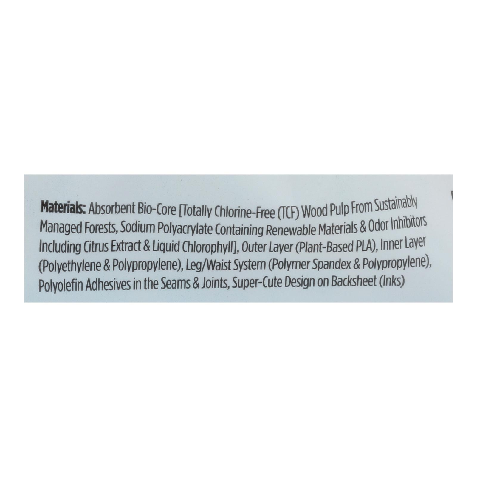 ingredients : absorbent bio-core [totally chlorine-free;tcf;wood pulp from sustainably managed forests;sodium polyacrylate containing renewable materials & odor inhibitors including citrus extract & liquid chlorophyll];outer layer;plant-based pla;inner layer;polyethylene & polypropylene;leg/waist system;polymer spandex & polypropylene;polyolefin adhesives in the seams & joints;super-cute design on backsheet;inks;wool pulp from sustainably managed forests